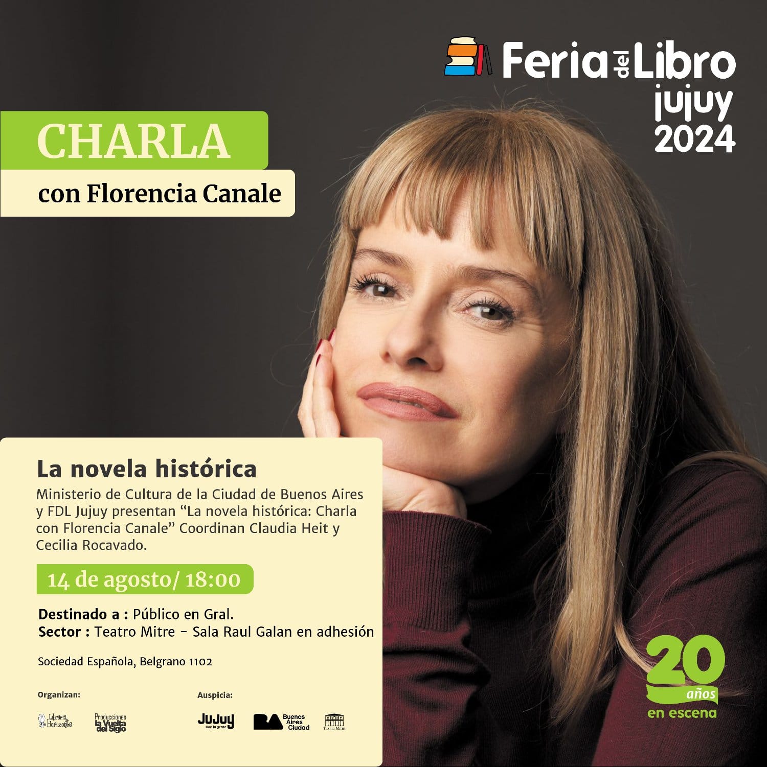 En una actividad conjunta entre el ministerio de Cultura de la Ciudad de Buenos Aires (CABA) y la Feria, el público jujeño podrá encontrarse con la autora Florencia Canale, en la charla “La novela histórica”, que además coordinarán Claudia Heit y Cecilia Rocavado.