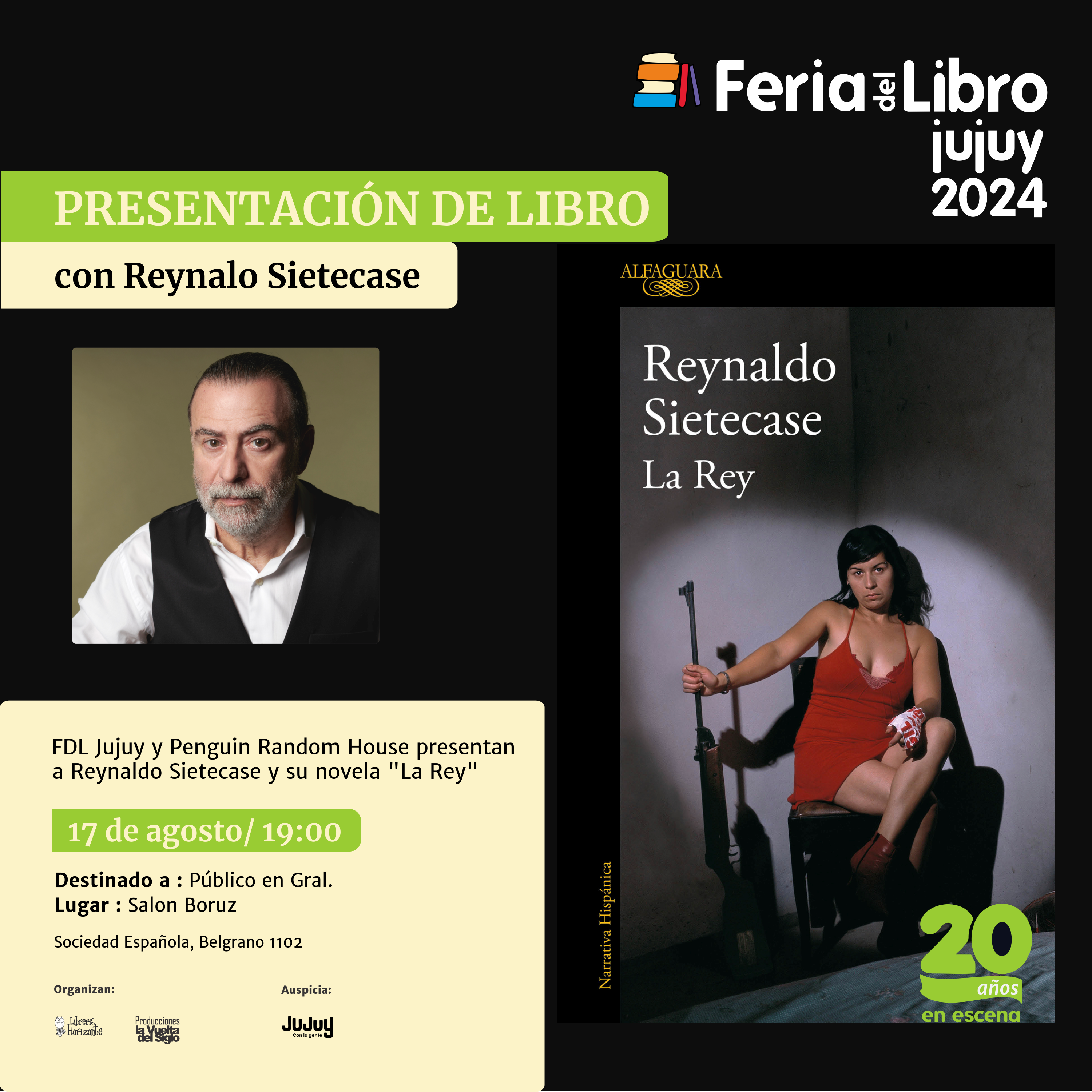 El reconocido periodista y escritor Reynaldo Sietecase, visita la Feria del Libro Jujuy en la celebración de los 20 años de este gran acontecimiento cultural, la cita es este sábado 17 de agosto a las 19h., en el Salón Boruz de la Sociedad Española (Belgrano 1102), en San Salvador de Jujuy. La programación completa puede consultarse en feriadellibrojujuy.com.ar